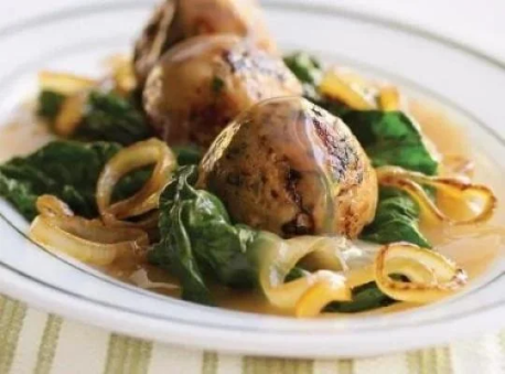 Servir les boulettes de viande sur un lit d'épinards cuits à la vapeur et d'oignons caramélisés.