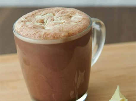 Boisson chocolatée chaude préparée avec du lait moussé à la vapeur, de la poudre de chocolat et du sucre, agrémentée d’une saveur sucrée et crémeuse grâce à l’ajout de sirop de chocolat blanc.