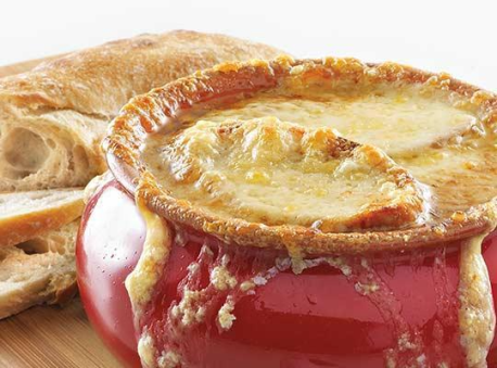 3Pour le service : Porter 6-1/2 oz / 195 ml de soupe dans un bol épais. Placez 2 tranches de pain français grillé sur le dessus de la soupe (pour flotter comme un radeau), puis placez 2 oz / 56 g de fromage sur le dessus du pain. Placer le bol de soupe sous le gril jusqu'à ce que le fromage soit fondu. Servir chaud.